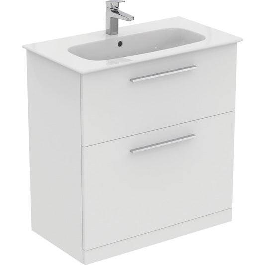 Modern Floor-Standing Vanity Unit with Elegant Chrome Accents The Ideal Standard i.life A Double Drawer Floor Standing Vanity Unit with Basin in Matt White with Brushed Chrome Handles combines contemporary style with practical storage, making it a perfect addition to any modern bathroom. Its sleek floor-standing design and subtle chrome...