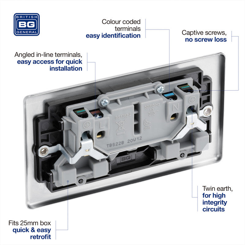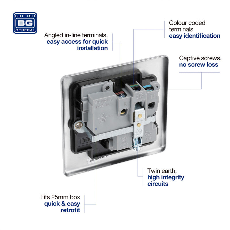 Upgrade your home or workspace with the BG Brushed Steel 13A DP Black Insert Switched Socket — a stylish, durable, and dependable power solution. Designed with a modern brushed steel finish and a sleek black insert, it delivers a premium look that complements both contemporary and traditional interiors.