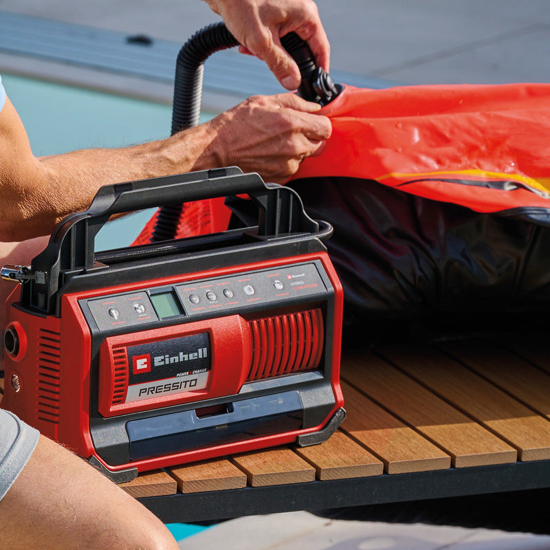 The Einhell PXC 18V PRESSITO 18/25 Hybrid Cordless Air Compressor Body Only is a versatile and portable air solution designed for both battery and hybrid operation. Its oil-free pump ensures maintenance-free performance, while the compact design makes it ideal for use anywhere, without the need for mains power.