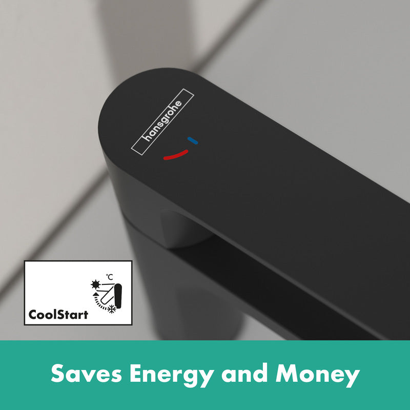 The Hansgrohe Rebris S 110 Tap blends contemporary style with efficiency. Its matt black finish, ergonomic design, and CoolStart technology make it a bold, durable, and eco-friendly choice for modern bathrooms.