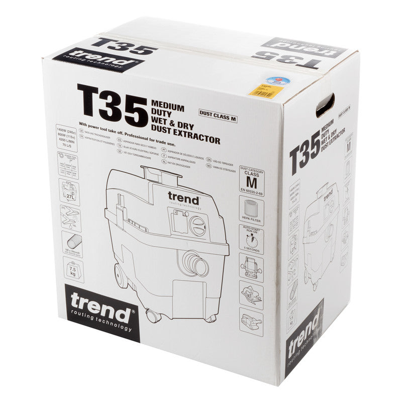 Maintain a clean and safe working environment with the Trend T35A M-Class Vacuum Extractor. Designed for professional workshops and construction sites, this powerful corded vacuum efficiently captures dust, debris, and hazardous particles at the source. With M-Class filtration, it meets strict safety standards for dust extraction, protecting both operators and tools. Available in 115V and 230V variants with 800W or 1400W power options, it delivers consistent performance for a variety of applications.